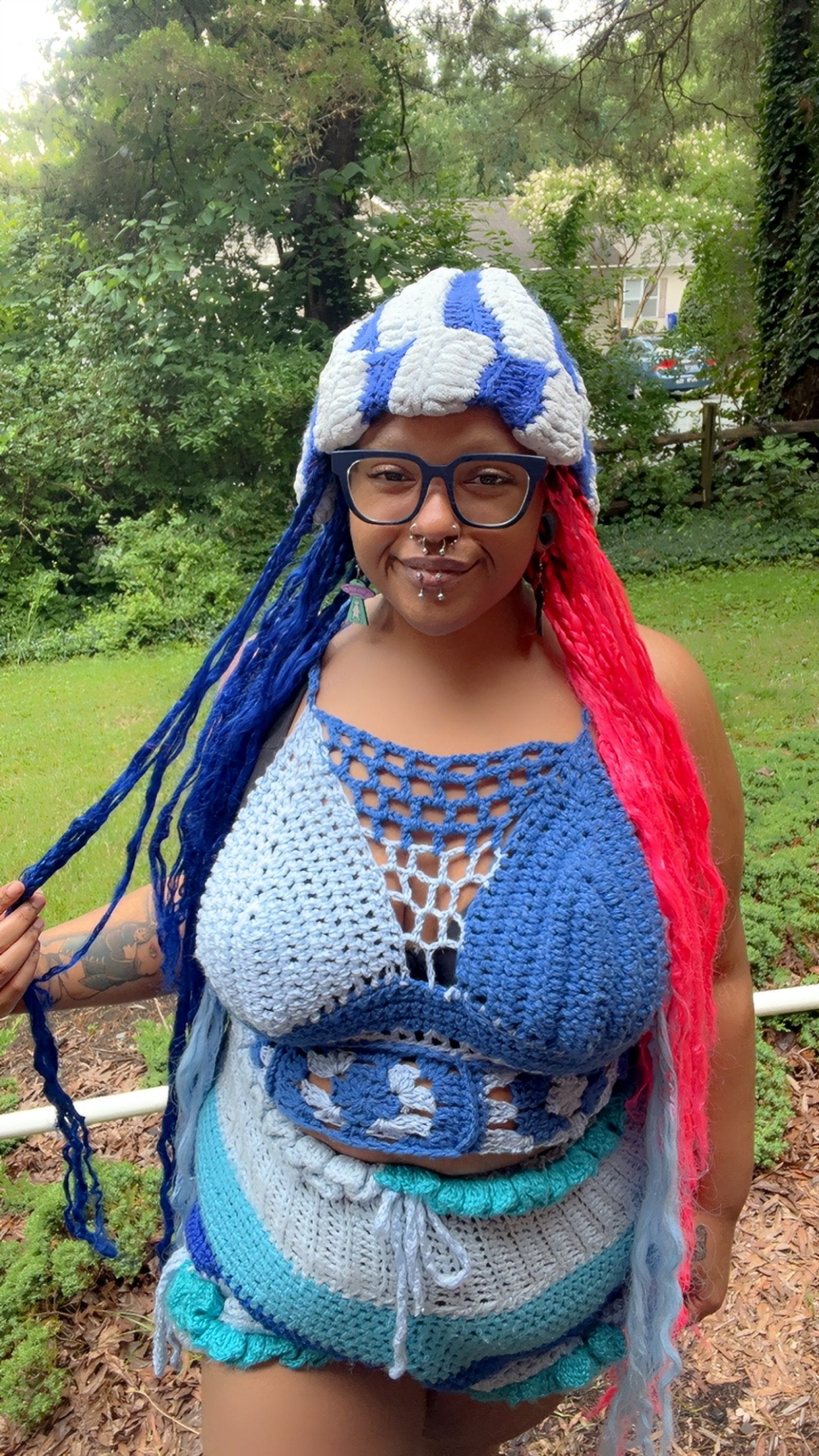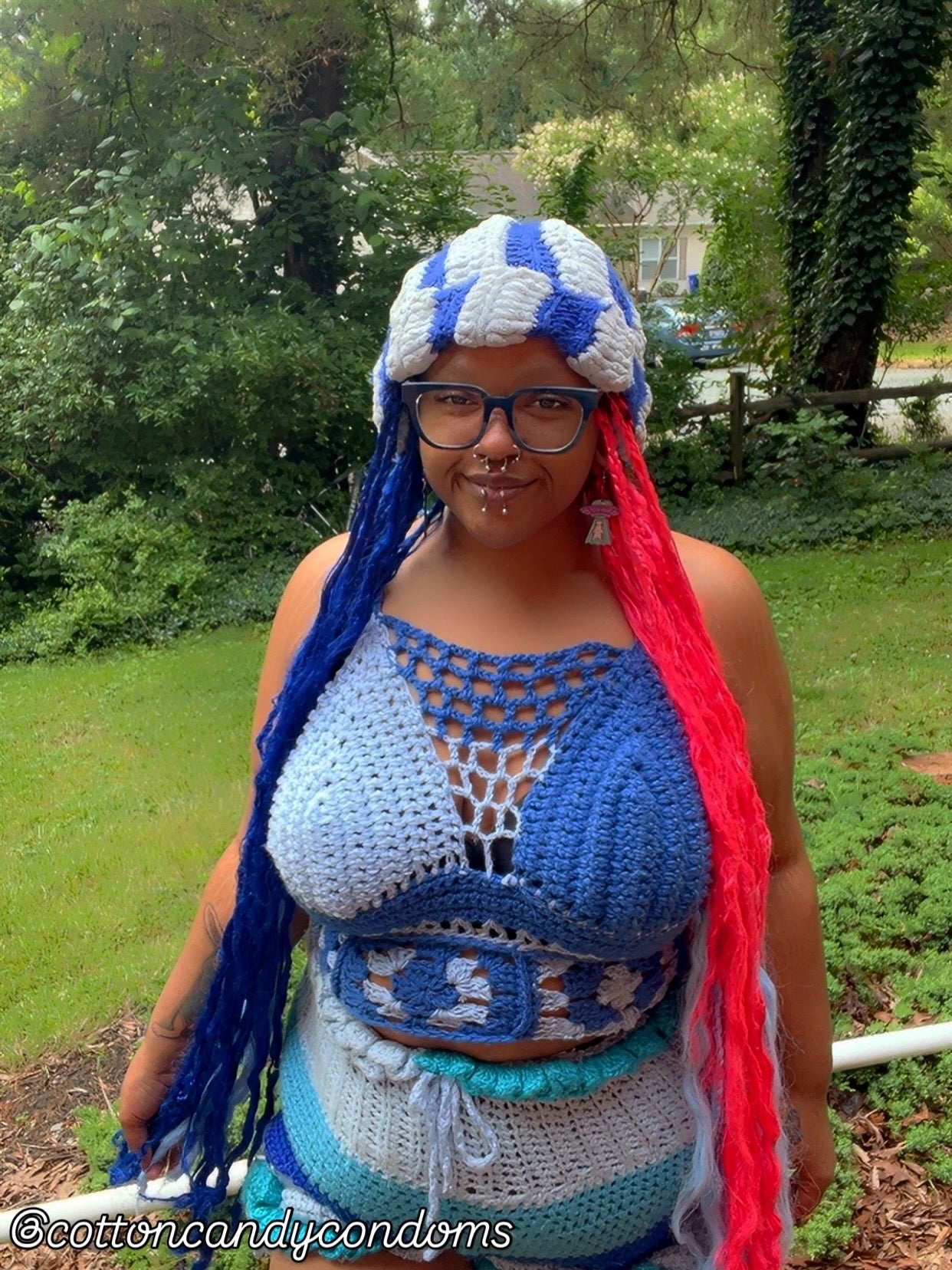 Introducing the Blueberry Bubblegum set! This set comes with a Bralette, Shorts and a hat. This set can be made in any 2 yarn colors & fishnet pattern is optional. Shorts can be in as many yarn colors as you want! Ruffles are optional & drawstring tie is also optional. I can also add elastic if you'd like. Please message the creator your measurements and colors you'd like if it's more than one, after purchasing! ♥ (Bralette: inches from nipple to underboob, inches around the upper waist & inches from shoulder to middle back // Shorts: around the waist, from waist to where your hips increase & from there to where you want your shorts to end, one size fits most with the hat)